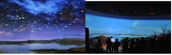 帶著對水洞溝的好奇,坐上大巴,很快見到了傳說中的水洞溝,剛走進(jìn)大門,看到的是一片荒涼,心中不免有些失望。隨著導(dǎo)游的聲音,走進(jìn)了水洞溝遺址博物館實(shí)景體驗(yàn)區(qū),我的心情豁然開朗,從繁星點(diǎn)點(diǎn)的蒼穹、裊裊升起的炊煙、成群奔跑的犀牛、鴕鳥、羚羊,到水洞溝人打磨石器、分割獵物、制作鴕鳥蛋皮項(xiàng)鏈,到家園被毀、水洞溝人含淚離開,我們在短短10分鐘內(nèi)體驗(yàn)到“夢回三萬年”的情景。一切都是那么真實(shí),那么鮮活,仿佛遠(yuǎn)古的水洞溝先民就從我們身邊緩緩走過。